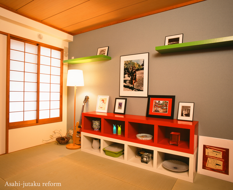 縁なしの畳を使用することでデザインの幅はぐっと広がります。クロスをはじめ棚や小物の遊び心溢れるカラーコーディネートにより、障子や押入れは残しながらも畳の部屋でもここまでモダンな印象になりました。