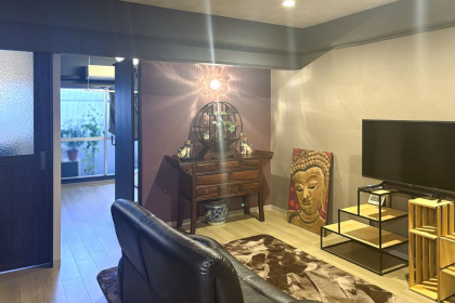 ビンテージマンションの1LDKの一室をリフォーム。お部屋の形状や梁を活かしながら内装や照明を変更し、雰囲気のあるモダンな空間をつくりました。