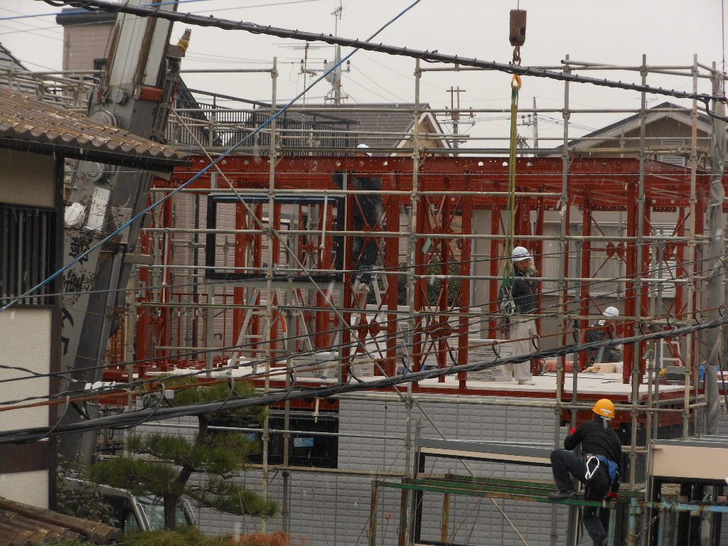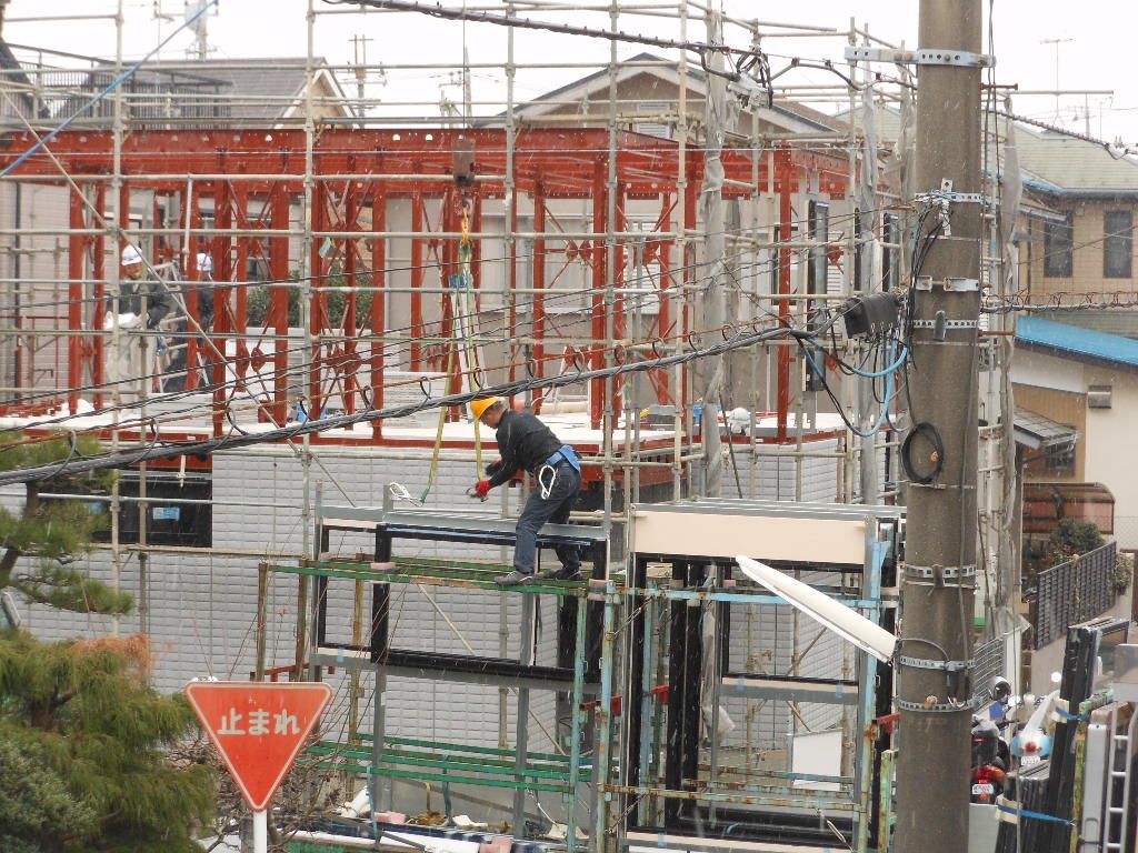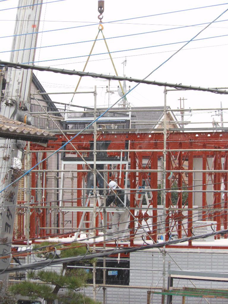 こんな感じで外壁を組立ていました。雪が降っているのも気にせず見学してました(^_-)
