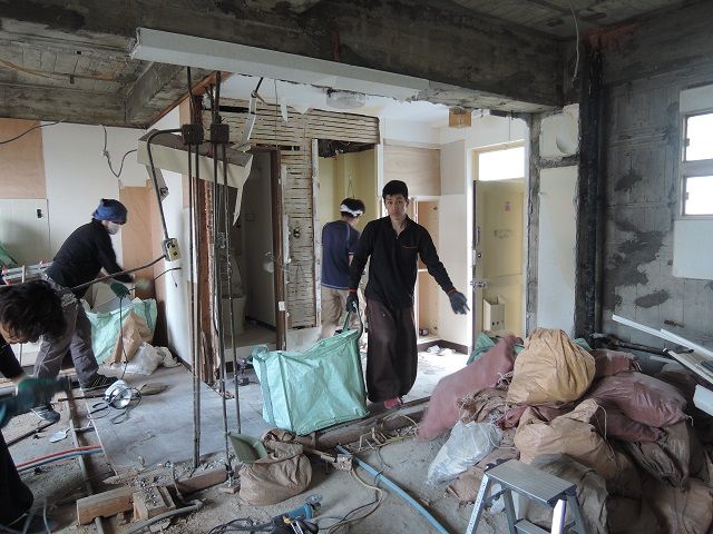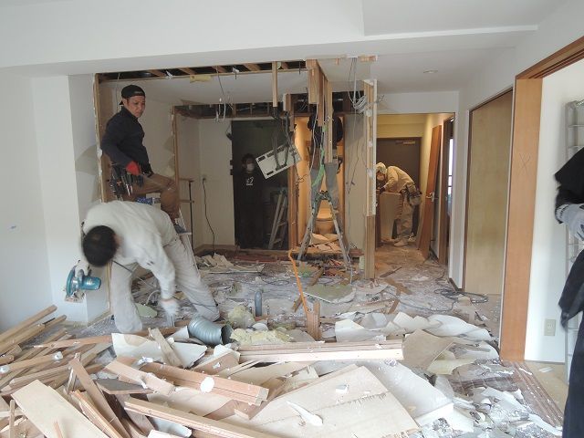 上の写真ですが・・壊しています!間取り変更に伴う、壁の解体 ぎゅーんぎゅーん!ばりばり!