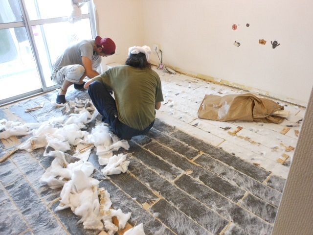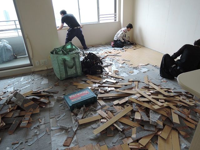 違う現場では、床の張替に伴う既存フローリングを剥がします!丸ノコで刻んで、バールでこじり手で引っ張りひたすら剥がします!