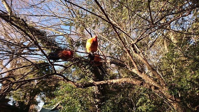 おまけ・・谷保天満宮で放し飼いの鶏です!(鶏ってこんな高いところへ登る?)