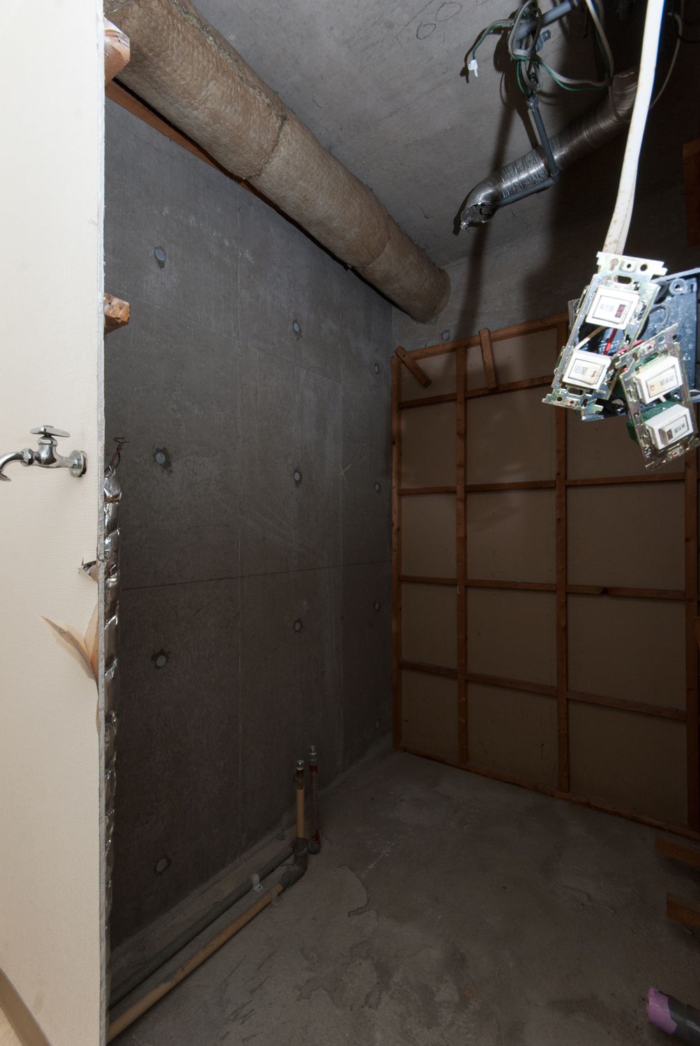 左はキッチン。設備がごそっとなくなっています。そして右はなんと、バスルームだった部分。見事に何も残っておらず、なんだかガランとしています。左上に見えるのはキッチンの排気ダクトなのだそう。