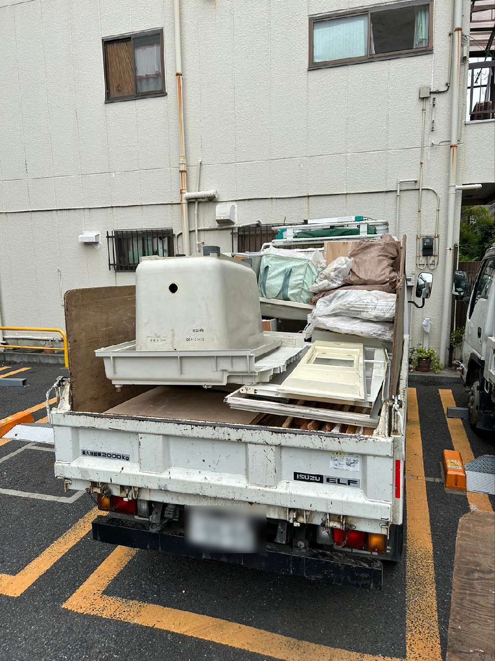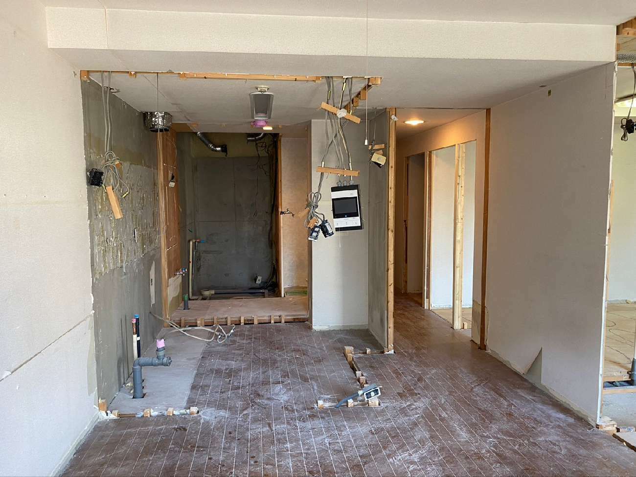 棚やキッチン部分が解体されました。キッチン部分を囲っていた間仕切り壁もなくなり、洗面室・浴室スペースの奥まで見えるようになりました。
