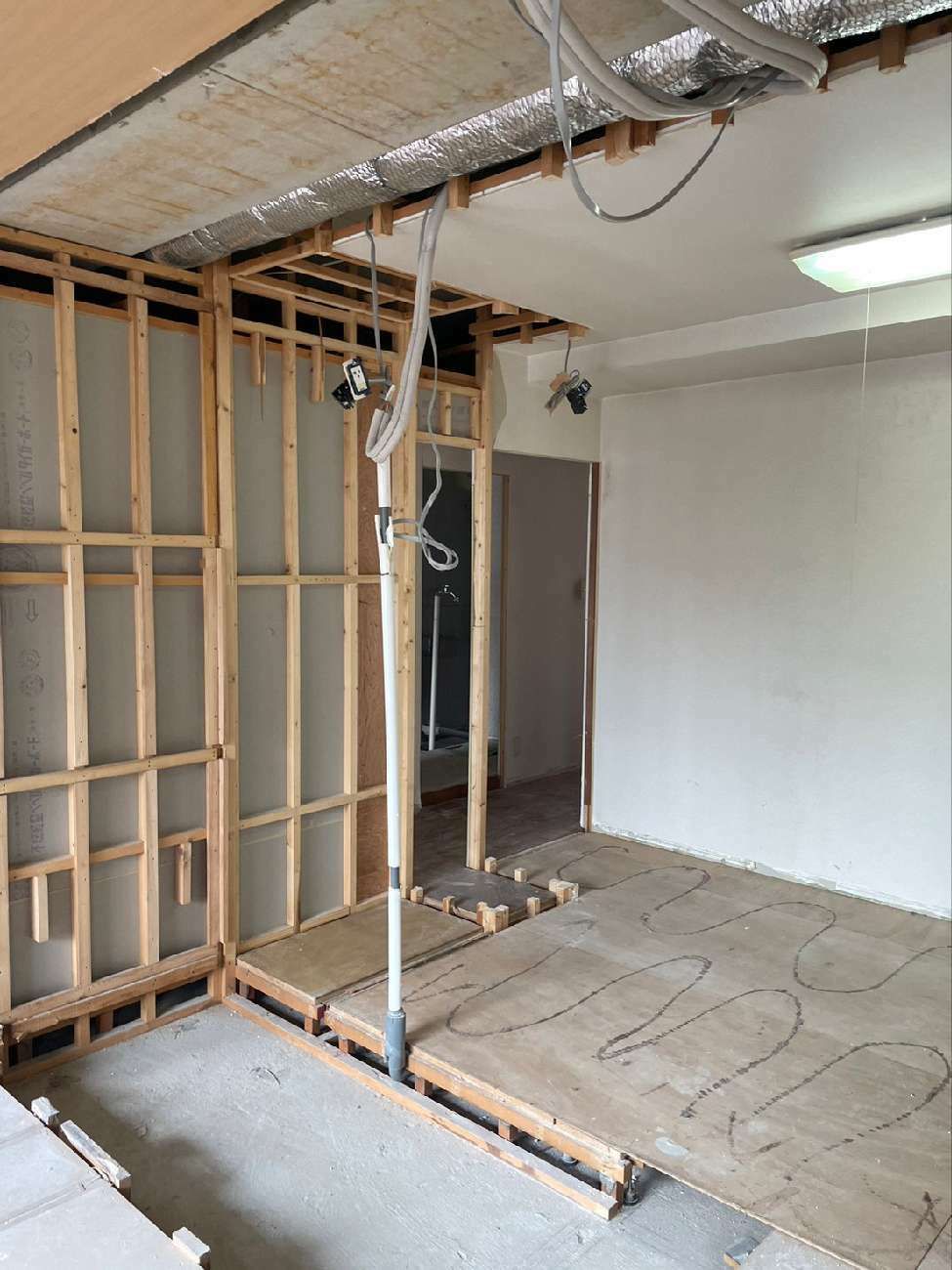 今回のリフォームでは床部分は既存の床の上に上張りをするため、解体はせずに配管工事をする箇所のみ取り除き作業をします。