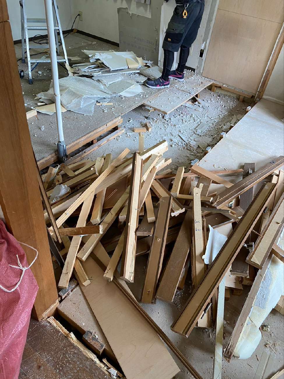 解体工事は既存の間仕切りや建具、設備を取り払い、処分する工程です。