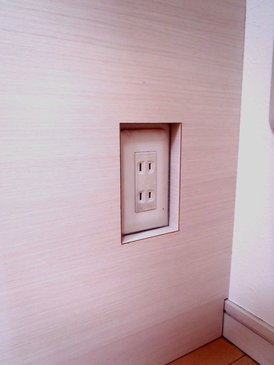 家具の左側にある既存のコンセント部分です。ぴったりくり抜かれています。職人さんの技が光りますね!!