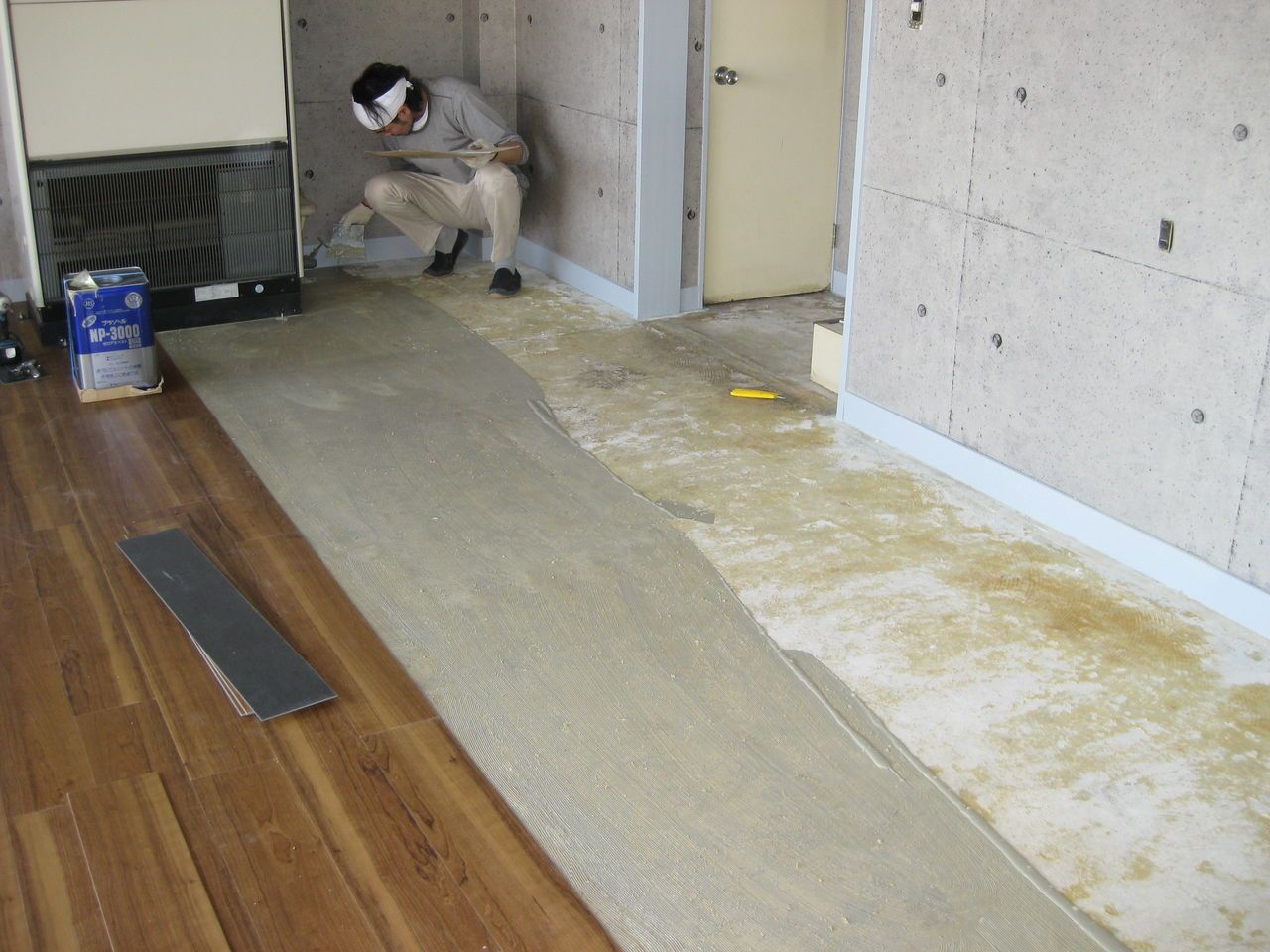 サイクルショップ(わかりやすく言えば自転車屋さん)の店舗改修で奮闘中の職人さんです。(床貼り作業/フロアタイル貼り)