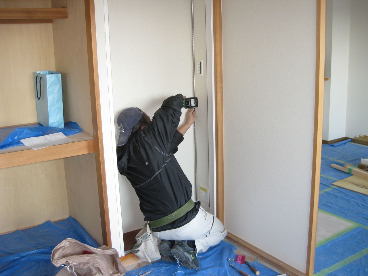 職人さんです。(可動棚板設置作業/棚柱取り付け)