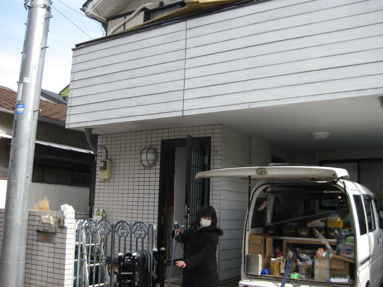 じつはですね、彼女が手にしているのは、水マキ用のホースです。このくそ寒い2月の月末に建物へ水を掛け調査をしているのです。