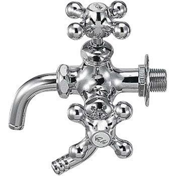 こちらは、ガーデニング用の立て水栓に取付るとホースを横のハンドルにつないだまま、上のハンドルで手を洗えちゃうんです。