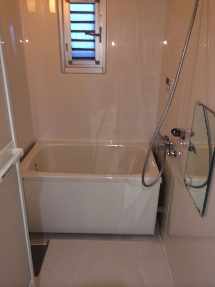 今回の建物は、管理組合で浴室に「システムバス」を入れられない決まりということで、内装工事のように既存の上からパネル・シートを貼るという方法で施工しています。