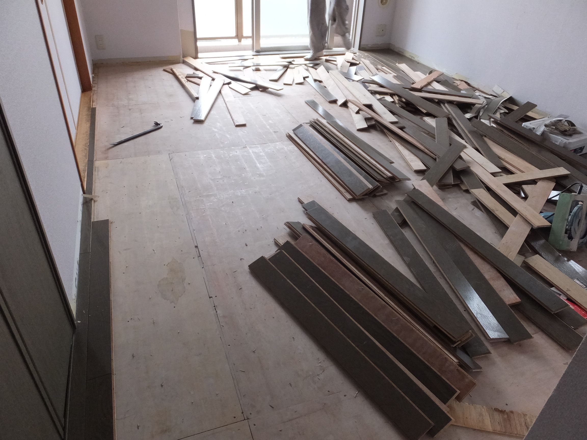 既存のフローリングは一列ごとのセパレートなタイプ。施工1本1本貼るので手間がかかります~。♪