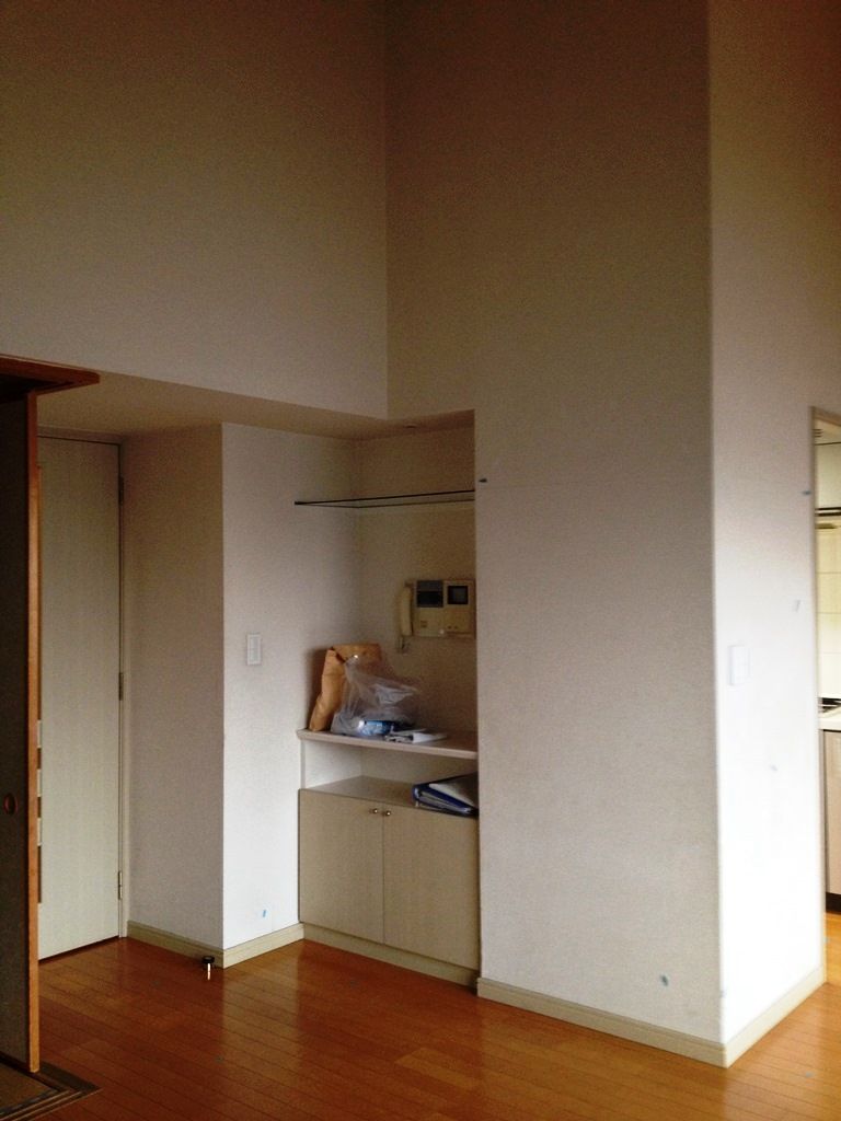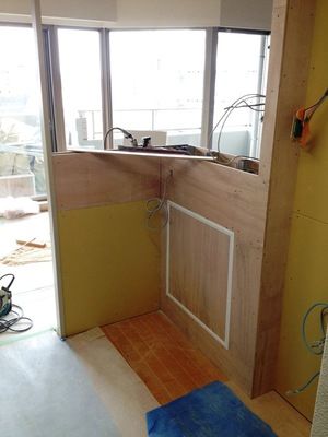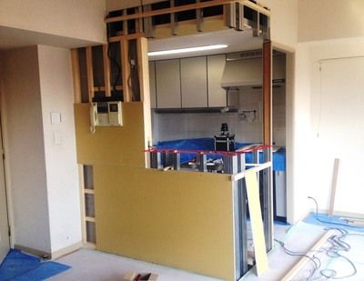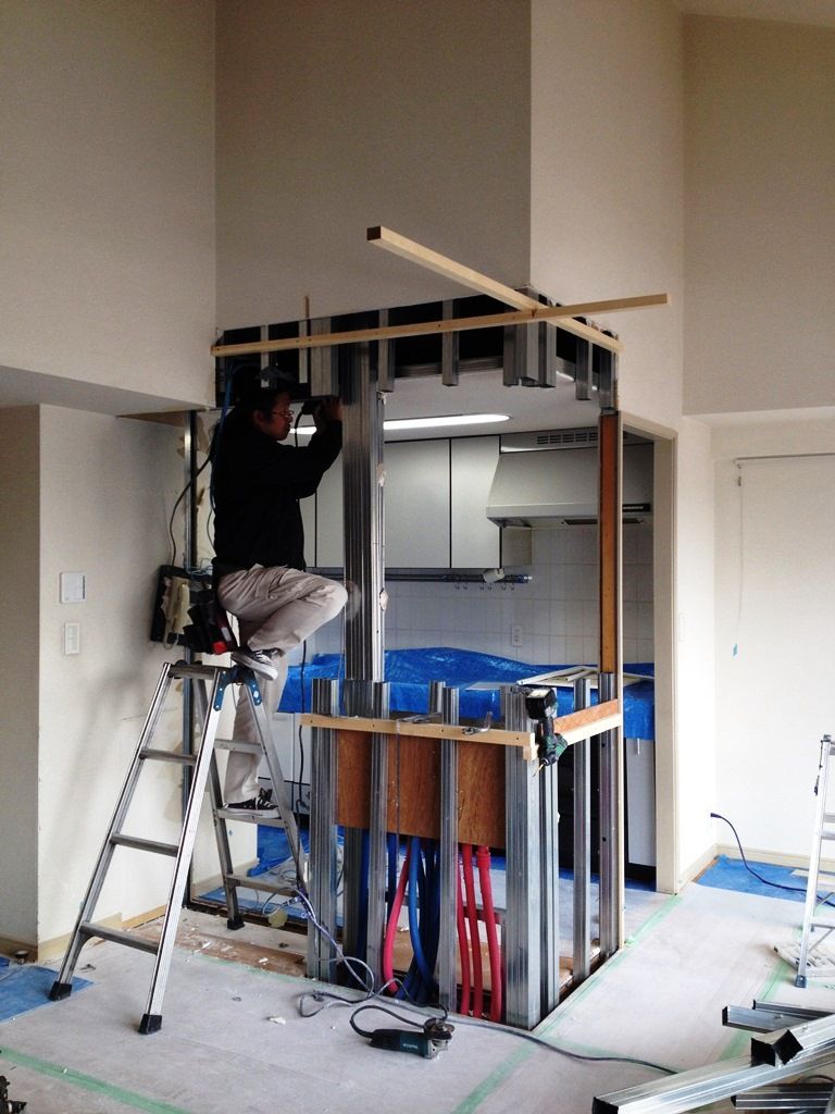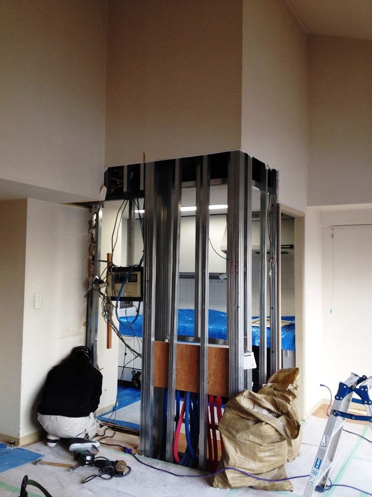新しく壁の下地を組み、せっこうボードを張って行きます。インターホンも移設しました❗