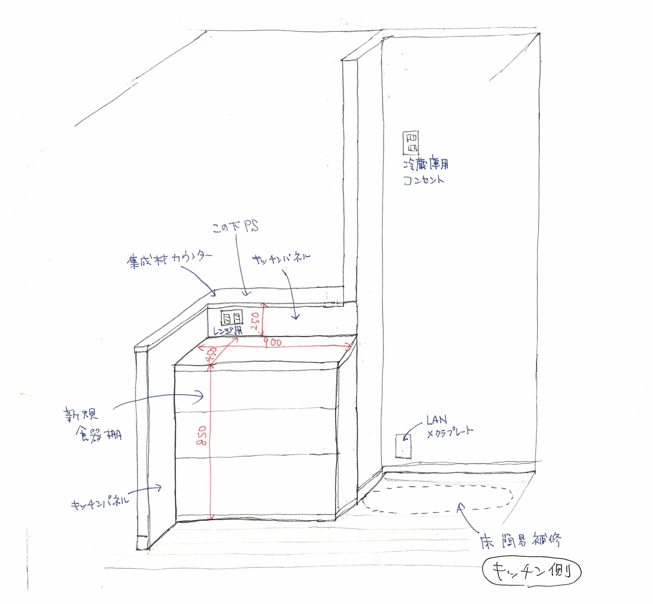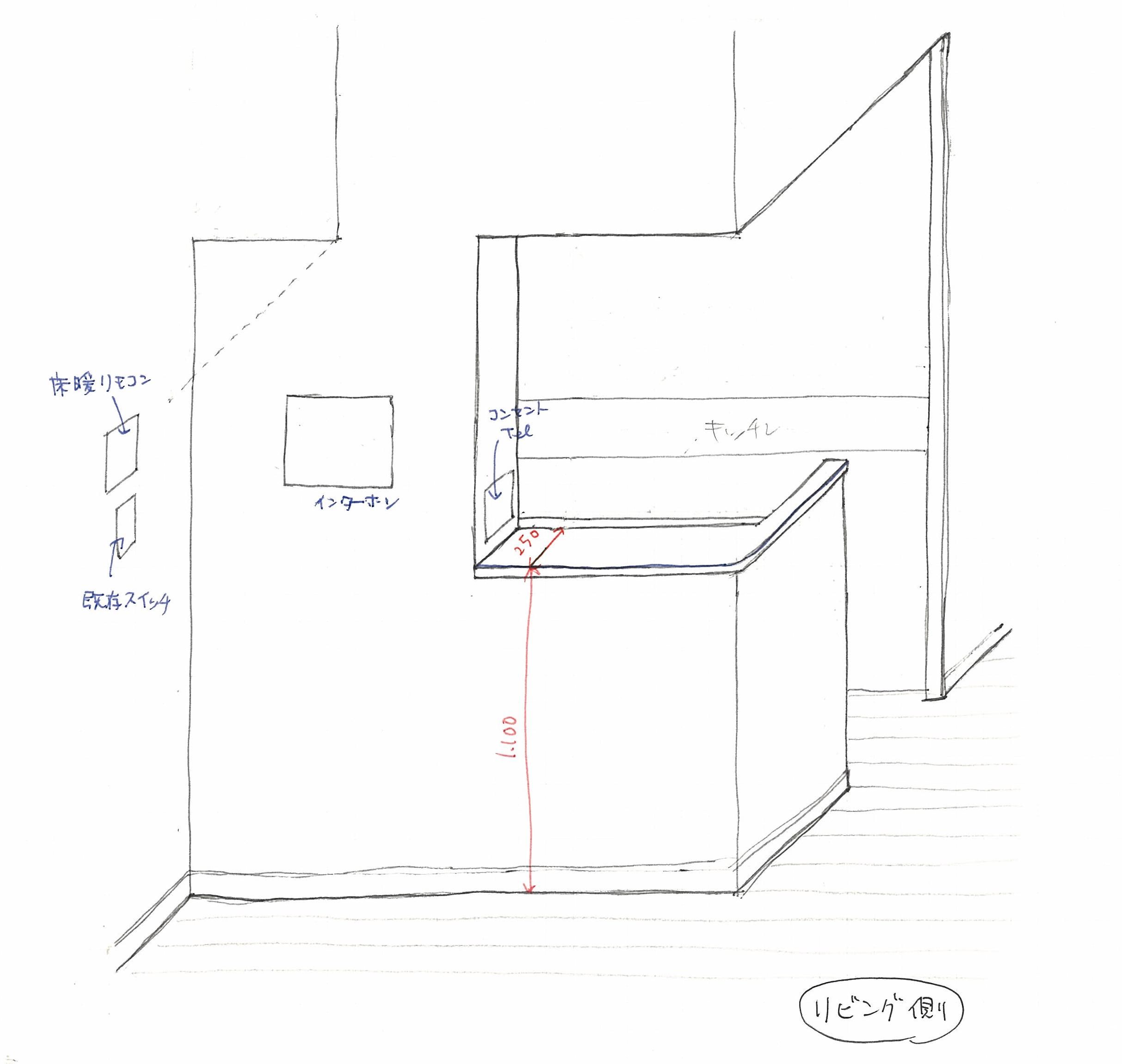 平面図と上記のような簡単な絵を使って、お客様とイメージを共有しました(^_-)