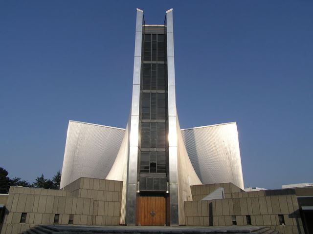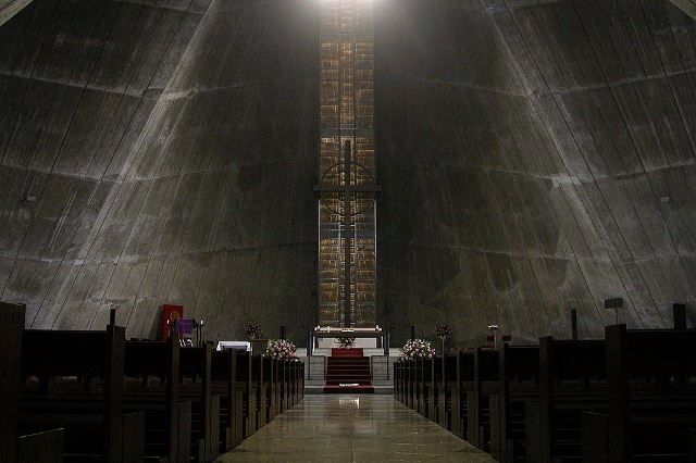 上から見ると十字架になっています。外観は、岩場の水面に舞い降りて来た銀色の白鳥が羽を震わせているかのようなイメージだそうです。