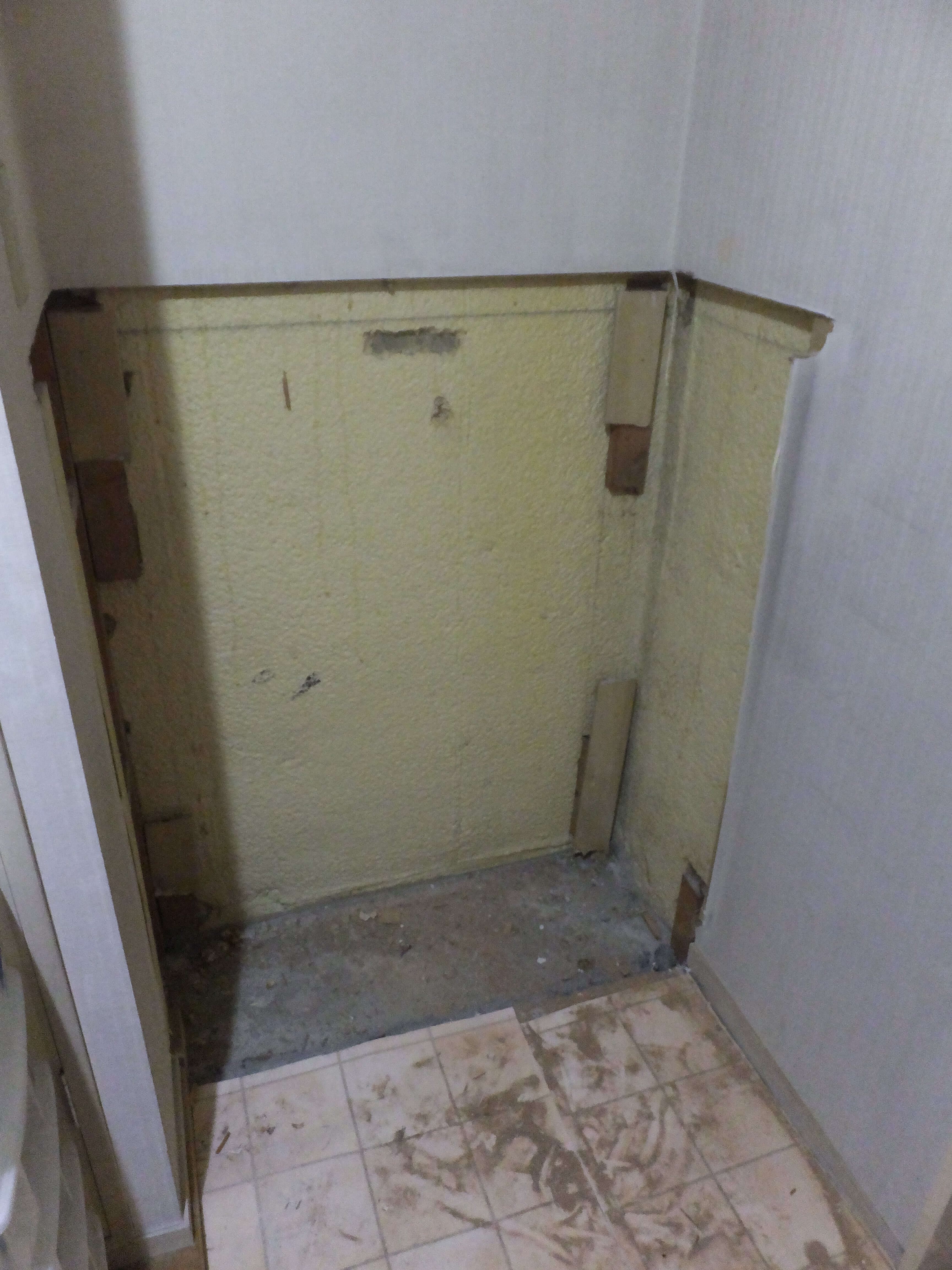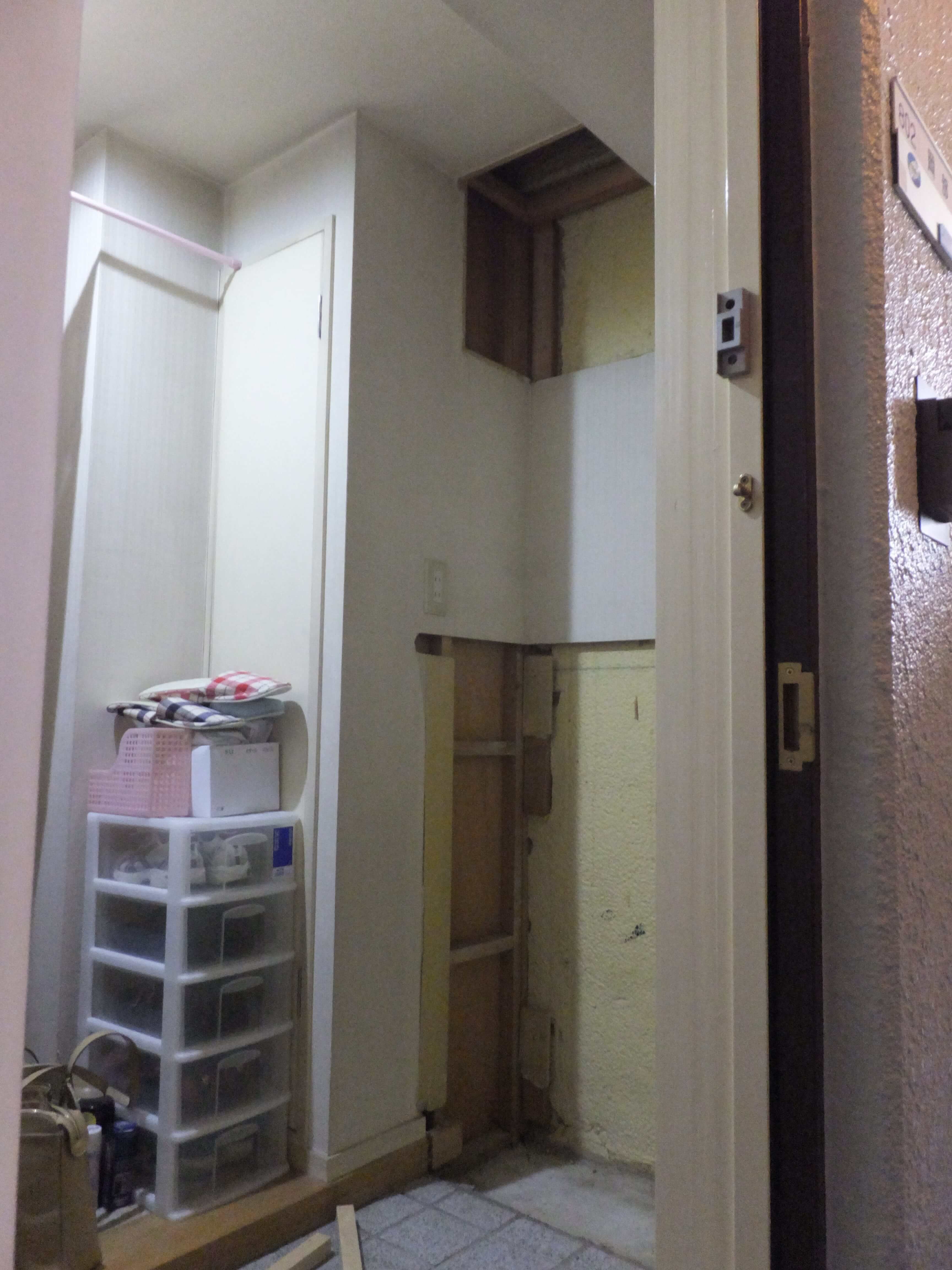 壊しながら撤去しています✨。先に下駄箱を取り付けてから、石膏ボードを張っていました。(右の写真)