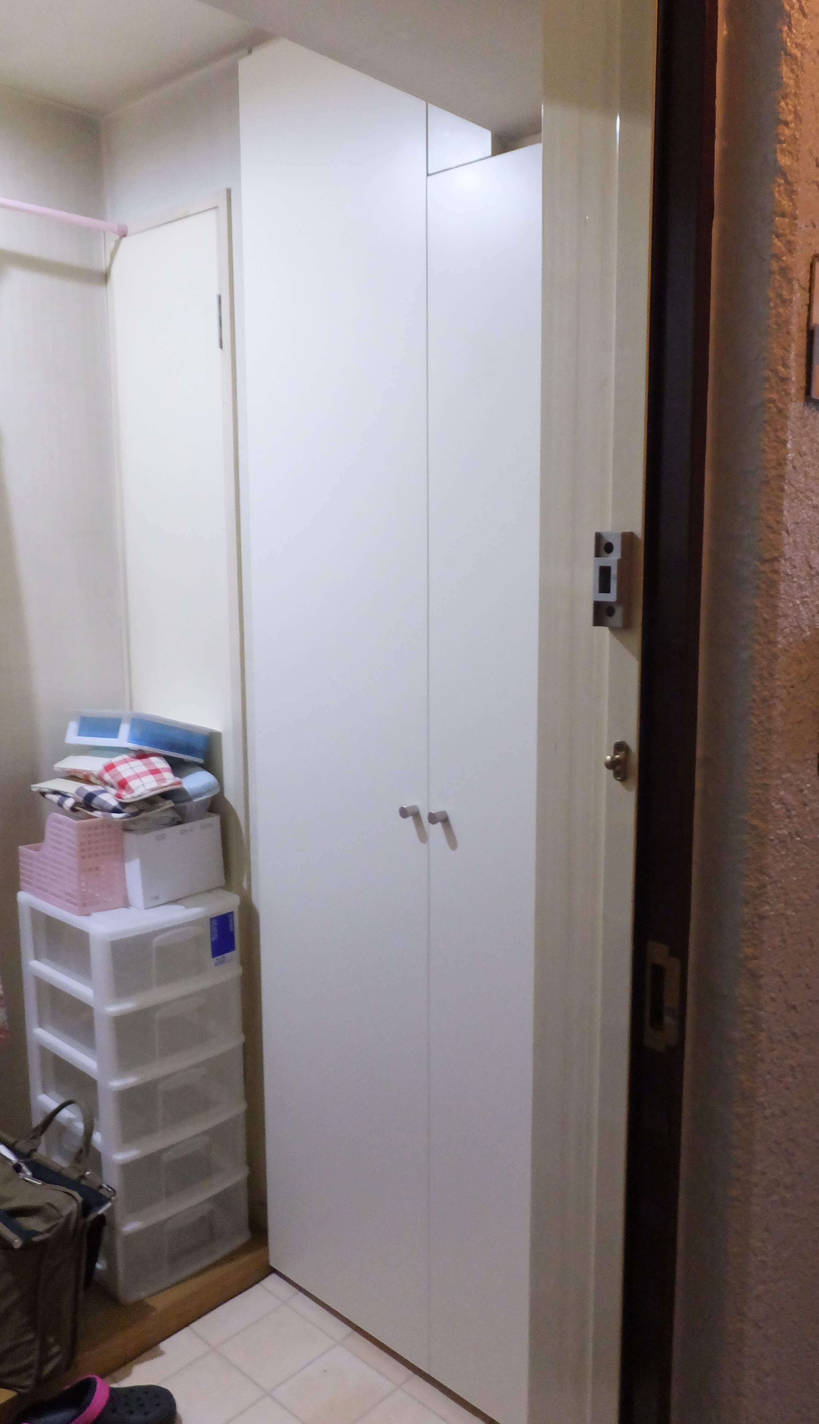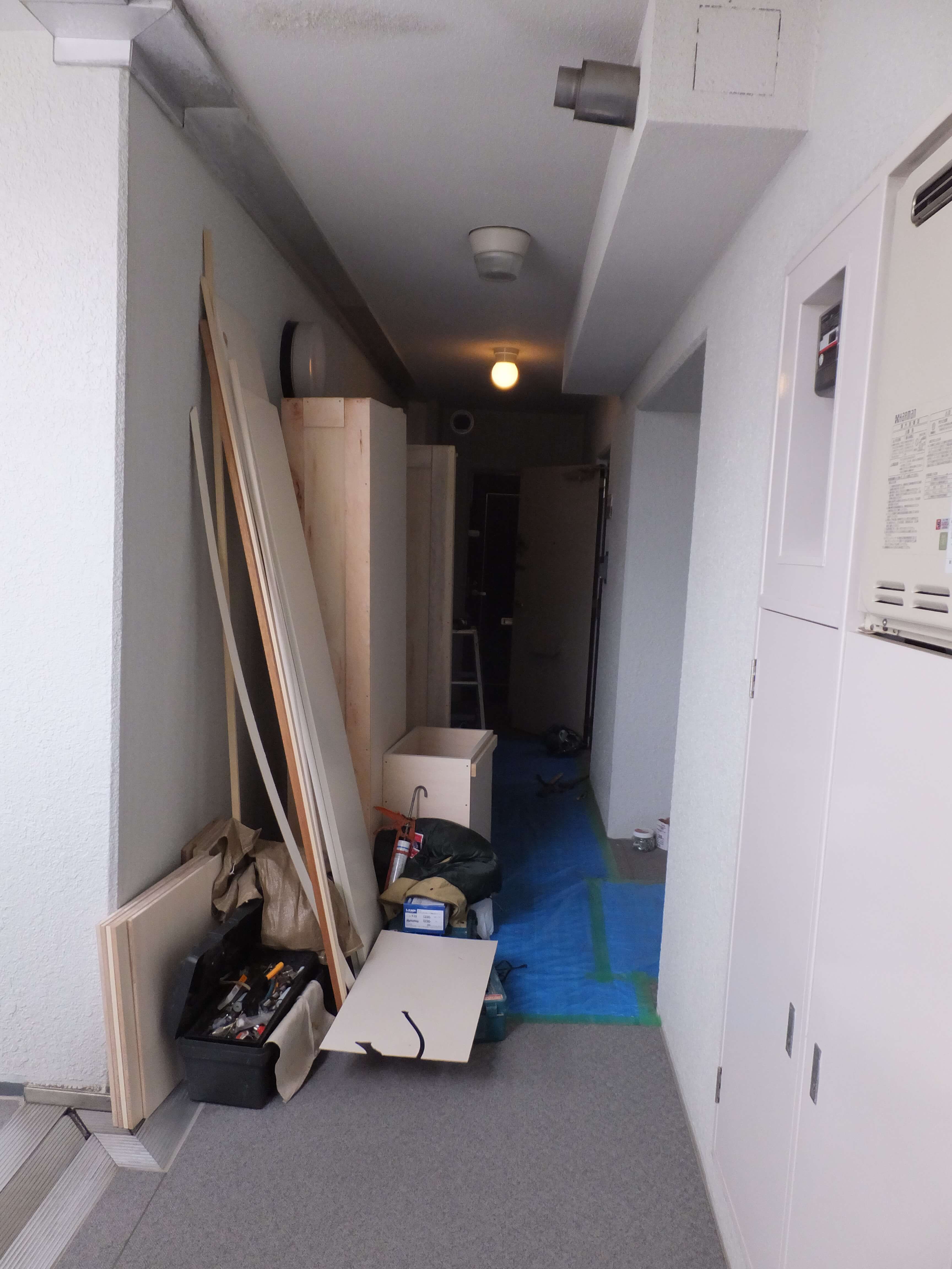 下駄箱撤去後です。共用廊下に新しい下駄箱を置かさせて頂きました。奥に他の方のお宅があります。事前にご挨拶させて頂きました。