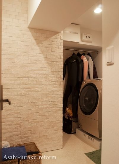 洗面室に白いレンガ風の調湿タイルを貼りました。お施主様のご要望によりウェットスーツを掛けるハンガーパイプも新たに取り付けました。