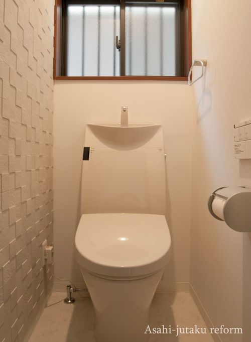 下の写真のように壁の片面やトイレ正面の壁の一部にアクセント貼りするケースも多いです。