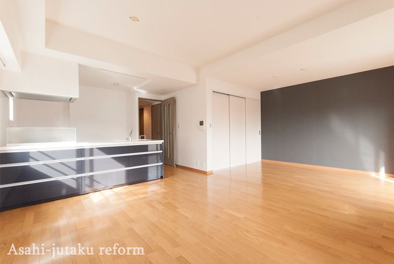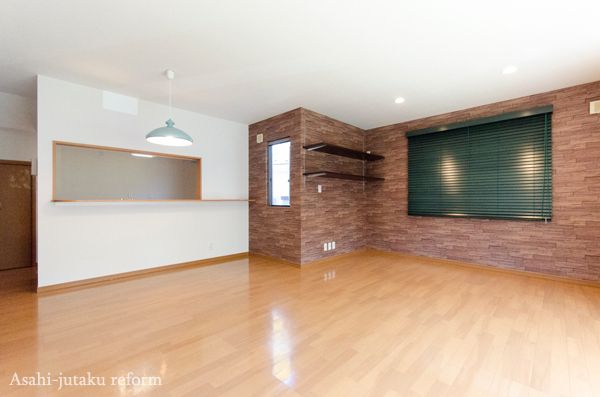 和室をなくしてリビングを広げたため、リビングの面積が増えましたが、濃い色の壁紙が空間の印象を引き締めてくれスッキリとした印象に仕上がっています。