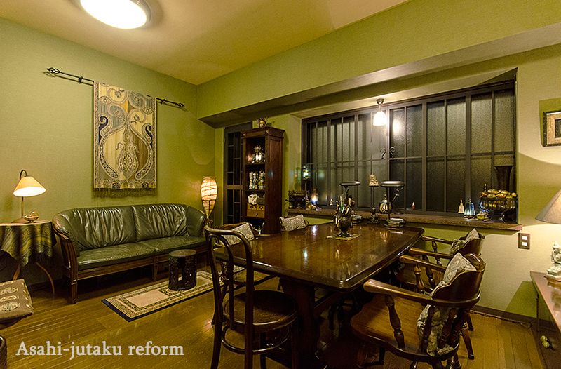 (モスグリーンのクロスを貼りました。お客様は実際に仕上がりを見るまでは「濃すぎたかもしれない」と心配もされていたようですが、壁に貼られたクロスを見て「意外と薄く感じます。とてもいい色で気に入っています」とお喜びでした)
