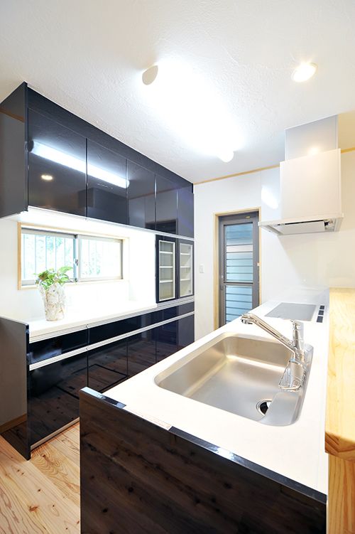キッチンが壁に向かって作られています。リビング、ダイニングとの間に、壁や仕切りがなく、お部屋の一部になったようなキッチンです。