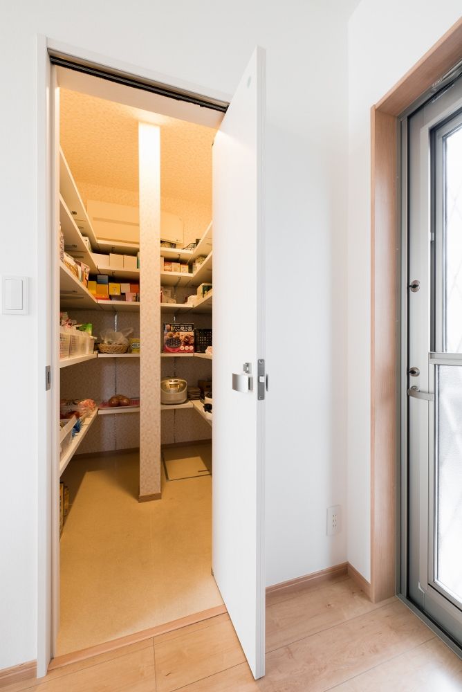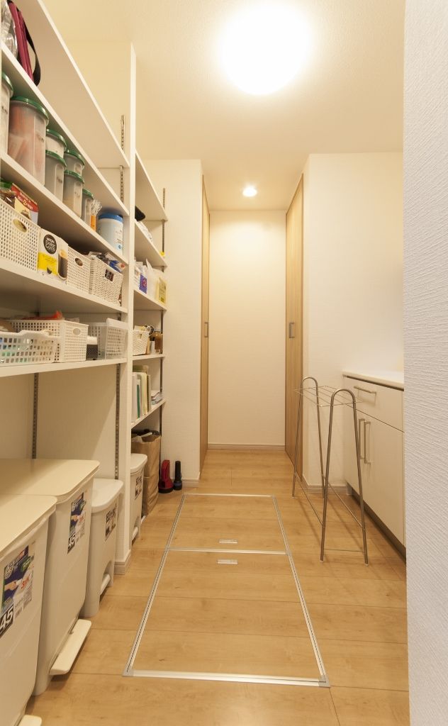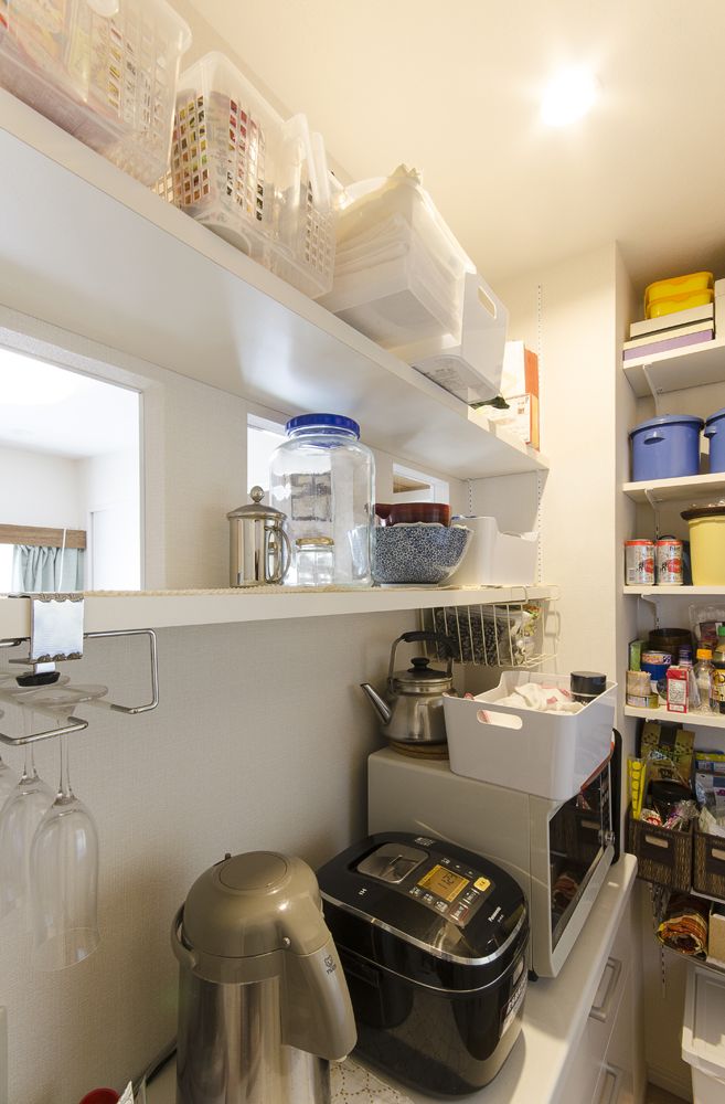 キッチンのお隣に広さ1坪のパントリーを新設。壁に沿ってコの字型に可動棚を配置して大容量の収納力を備えました。食品や大きな調理器具を置くためのスペースとして活躍しています。