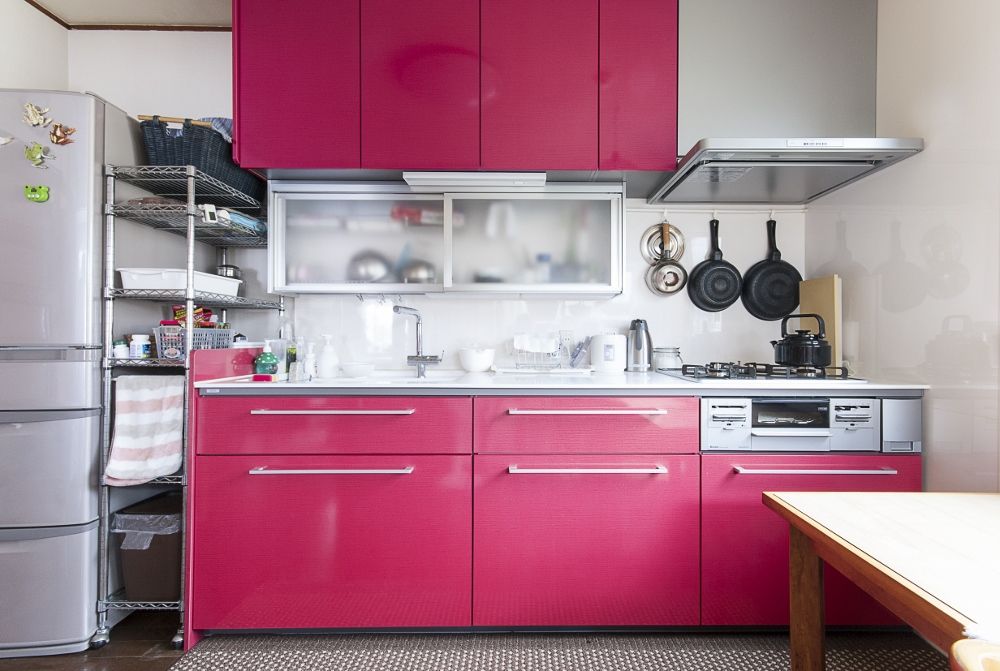気分まで明るくなるようなラズベリー色が印象的なキッチン。コンロ前の壁にはフライパンや片手鍋などを吊るしています。半透明のウォールキャビネットは収納以外にも水切りカゴとしても使えるもの。シンク前が開口部分になっていない壁付けキッチンだからこそ活用できるスペースです。