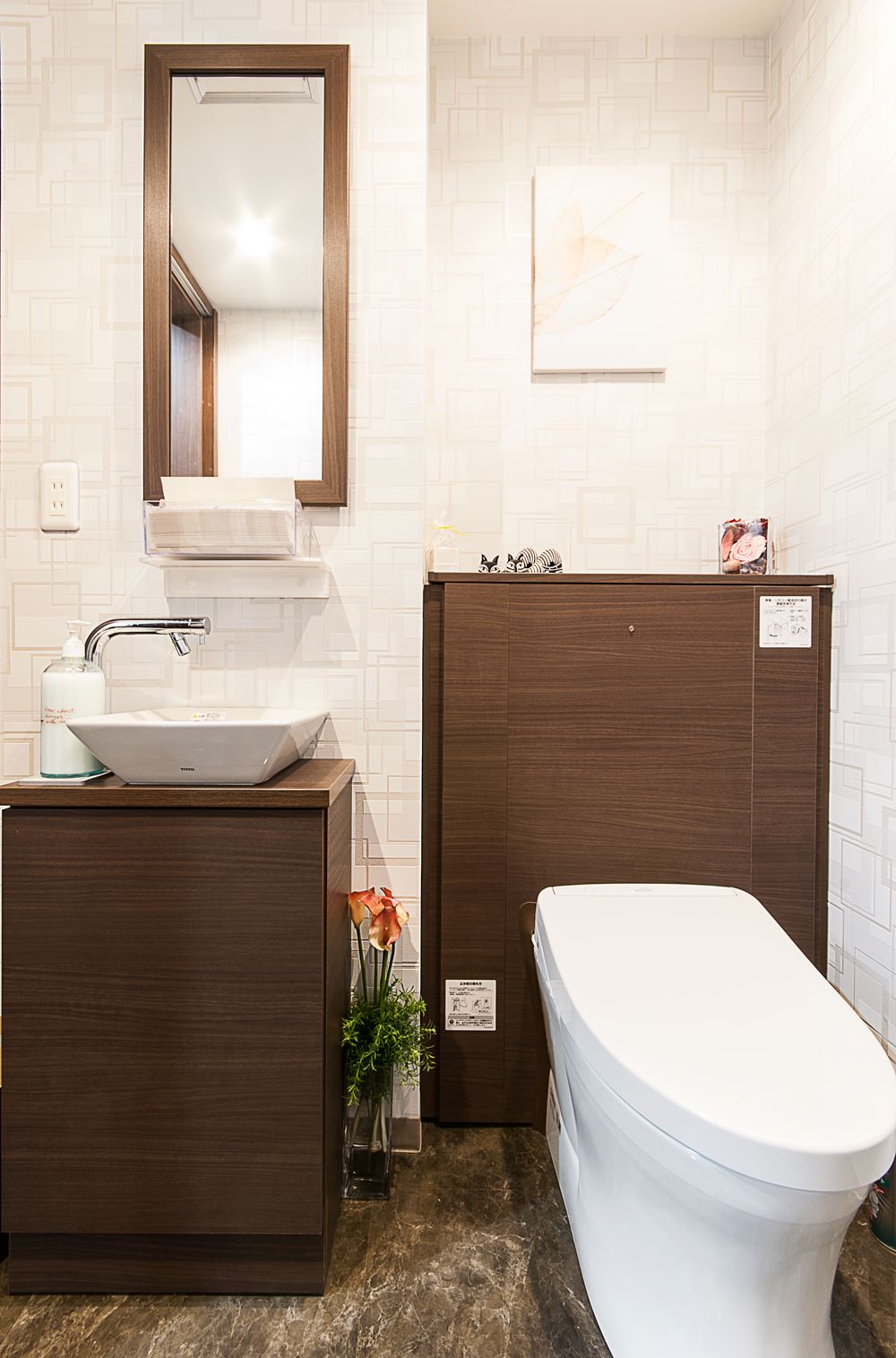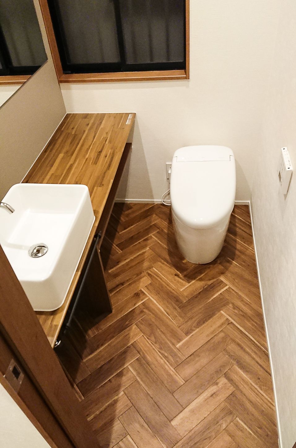 お好きなデザインの手洗いを造作することでデザイン性の高いトイレ空間が実現できることも魅力。ただ、このような独立した手洗い器の設置には新たに給排水管を立ち上げる必要があるため、床や壁を壊して配管工事をすることが出来ないお家では採用できません。