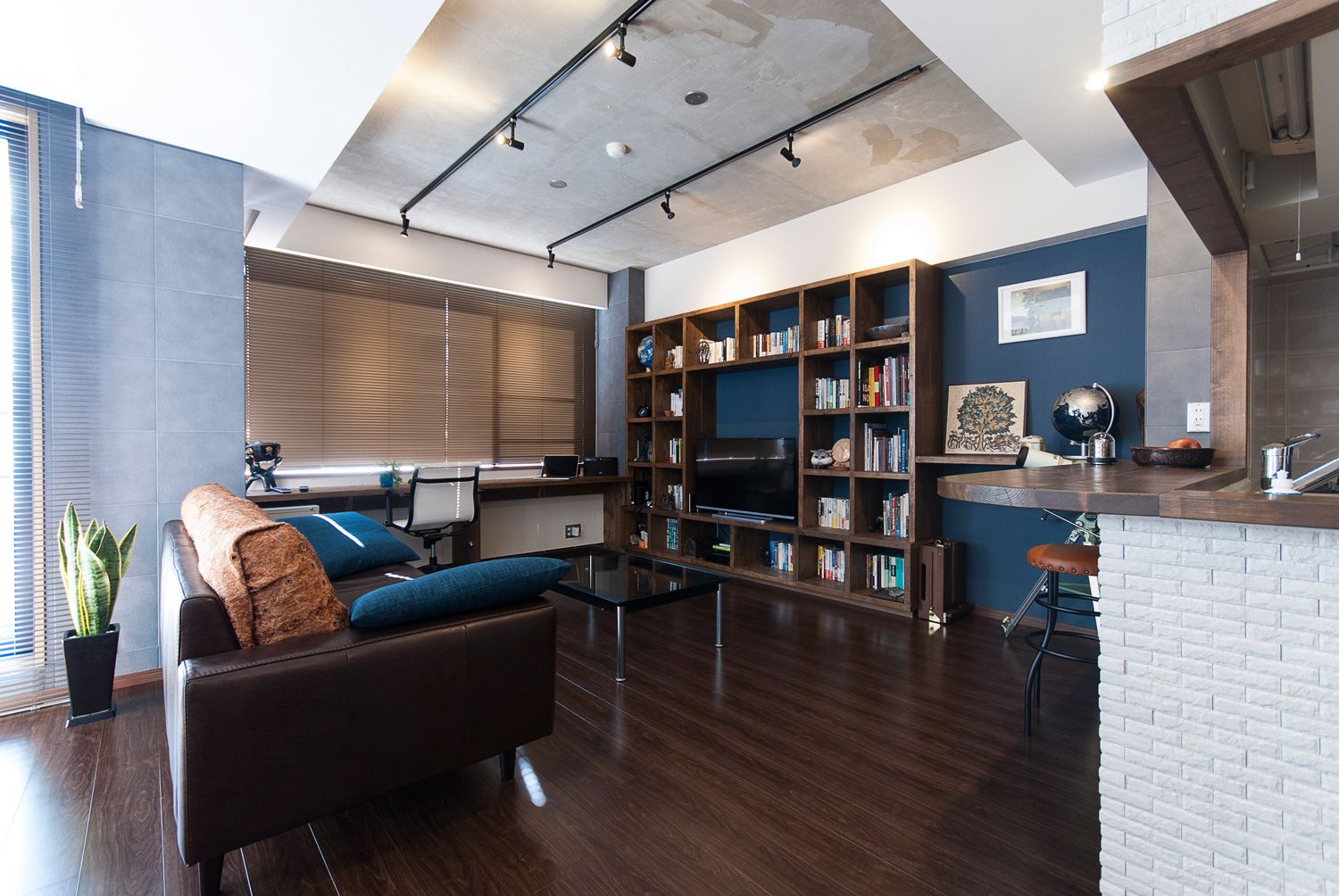 天井の一部をコンクリート現しにして、黒いダクトレールを2本取り付けスポットライトを設置しました。スポットライトの光によって、コンクリートの質感や天井の凹凸が強調されて趣が増したように感じます。