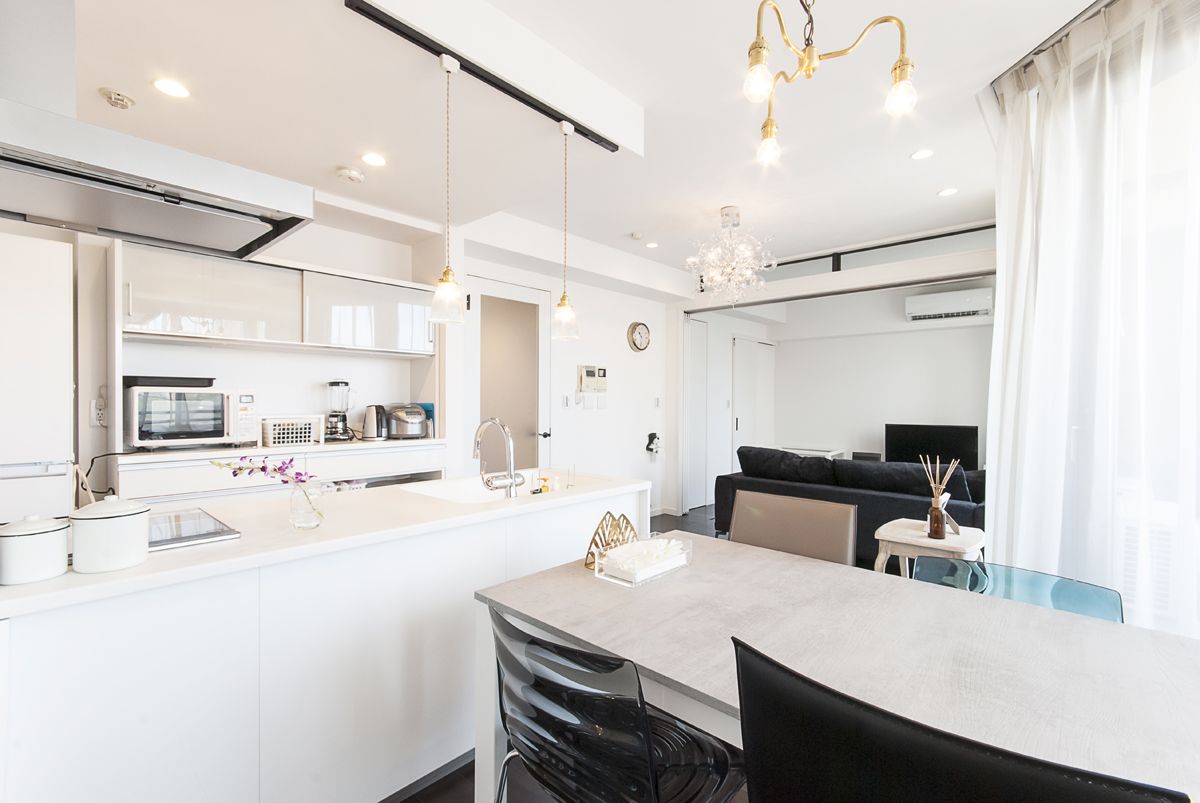 開放感が気持ちいいオープンキッチンの上部にダクトレールを設置。小ぶりで可愛らしいペンダントライトがフレンチテイストな空間とよくマッチしています。