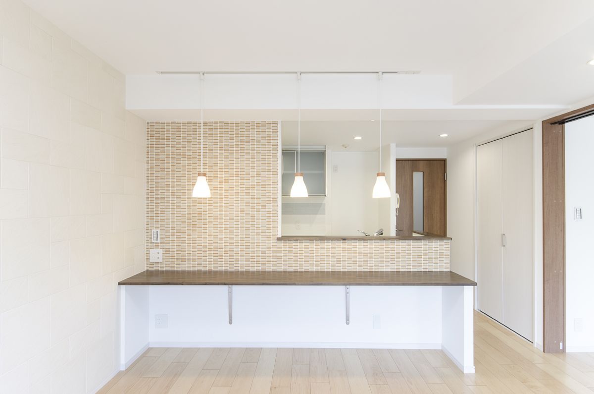 ダイニングのカウンターテーブルの上部にダクトレールを配し、ペンダントライトを3つ設置。壁のモザイクタイルと相まってナチュラルなカフェの雰囲気です。