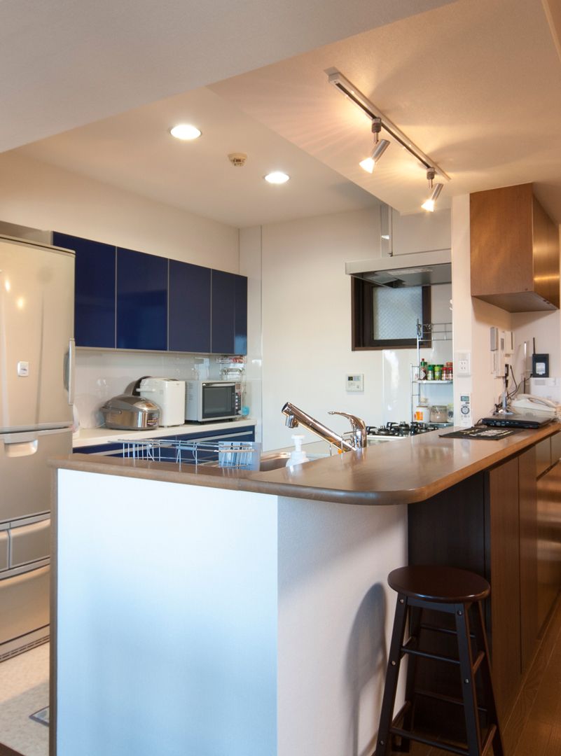 キッチンの上部にダクトレール&スポットライトを設置。調理中の手元も明るく照らします。