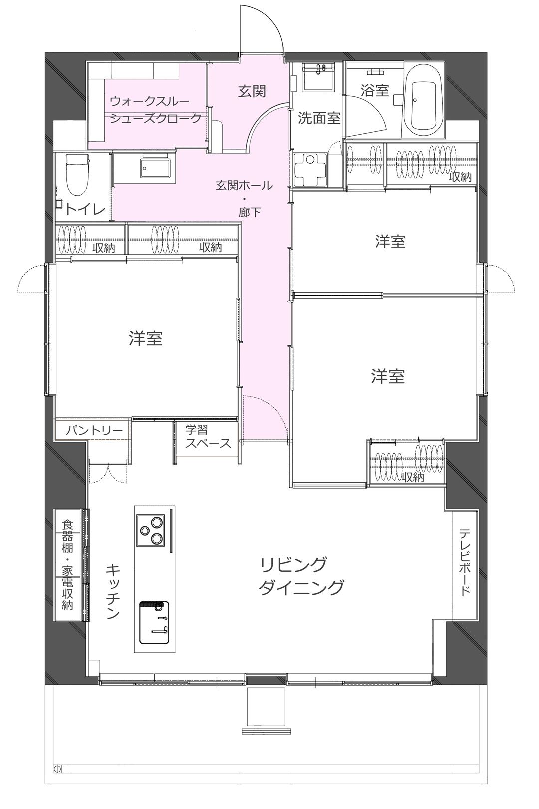着色部分:玄関~シューズクローゼット~ホール・廊下