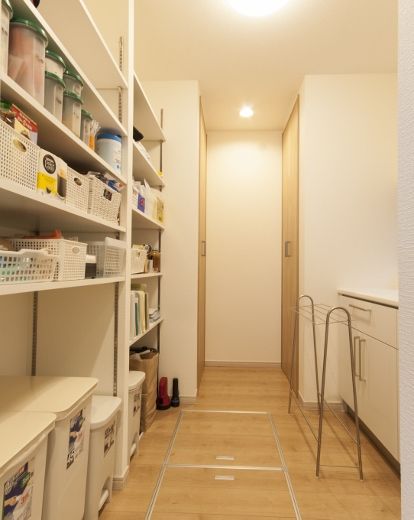 キッチンの隣にパントリーをつくった一例。食品だけでなく、食器や日用品、書類などを全てしまえる大容量の収納力があります。