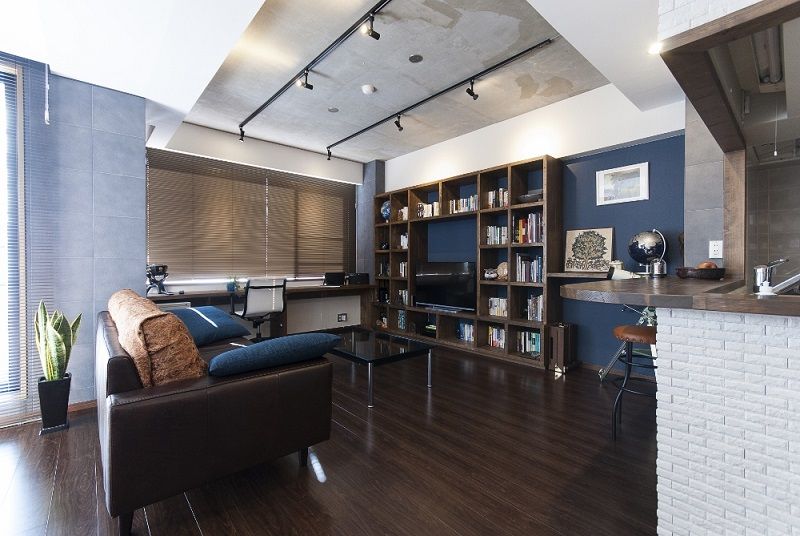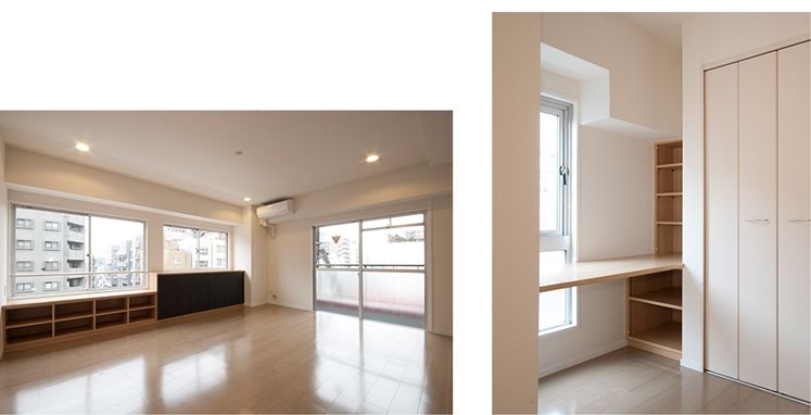壁面のテレビボード兼本棚、窓側のデスクカウンターを造作しました。