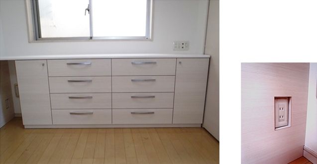 洋室の幅に合わせて棚を造作しました。奥行は小柄なお客様でも使い易い寸法にしています。