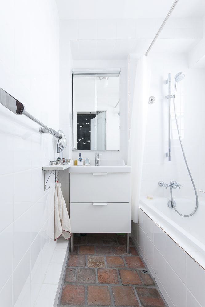 ドイツ製の水栓やバスタブを置いて海外スタイルのバスルーム&パウダールームに。真っ白な空間に床のテラコッタタイルが鮮やかです。