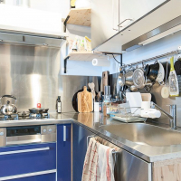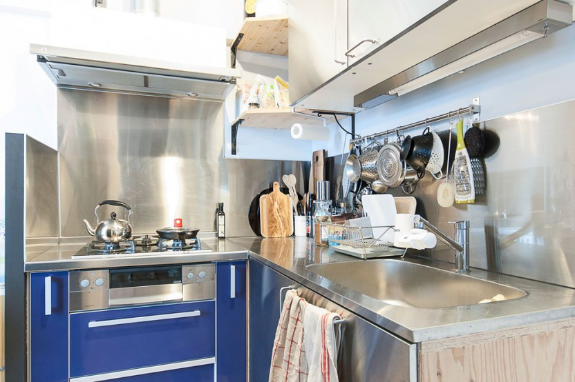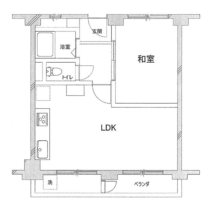 和室を含む1LDKの間取り。キッチンは壁に沿ってI型のシステムキッチンが設置されていました。