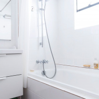 一度スケルトン状態にし、間取りを再構築。居室は洋室に変更、バスルームと洗面スペースを一体の空間にして海外スタイルに。