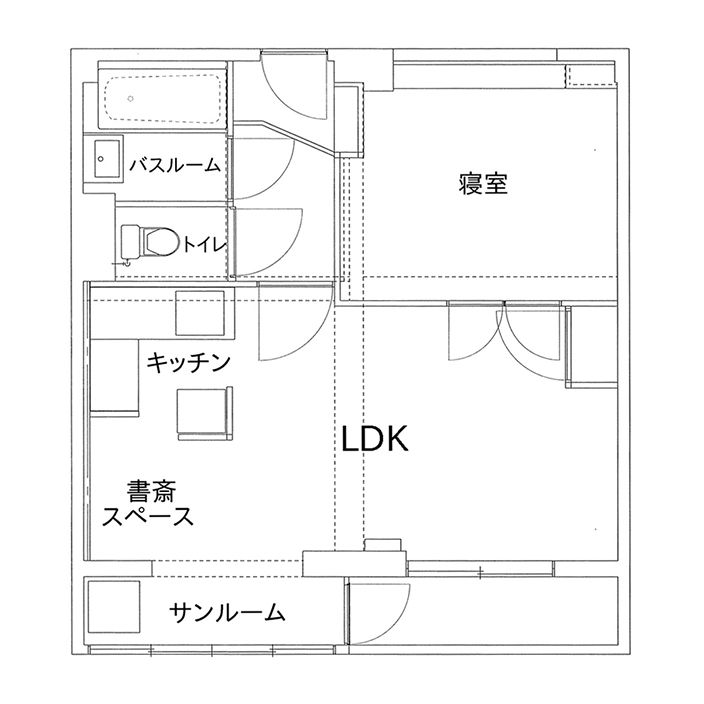 以前キッチンがあったスペースはI様の書斎スペースに。ご自宅でお仕事をすることも多いI様はサンルーム横の気持ちの良いスペースにデスクを置くことをまず希望されていました。そこで書斎スペースをまず配置し、それを軸にキッチンの配置を検討しました。