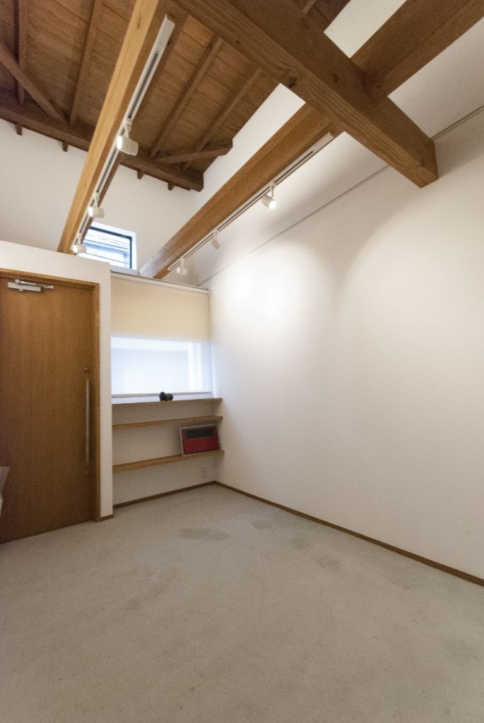 エントランスを開けると広がっているのは高さ3.8mの吹き抜けが気持ちよいギャラリースペース。壁に飾る作品が映えるように壁を真っ白に塗装し、2本の飾り梁にはダクトレールを配してスポットライトを取り付けました。木目の扉を採用し、木製の天井や梁を大胆に見せることで木もぬくもりを感じられるモダンなギャラリーが完成しました。