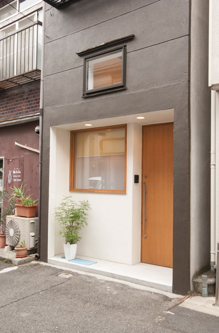 スクエアの形状を活かしたモダンな雰囲気の外観に。玄関扉横には大きな窓を設け、エントランスポーチにはグリーンを置く場所もできました。