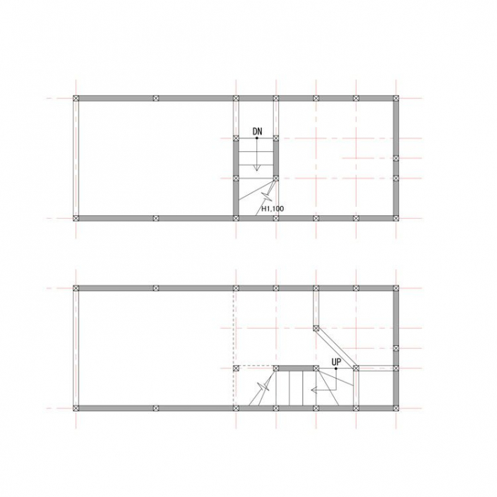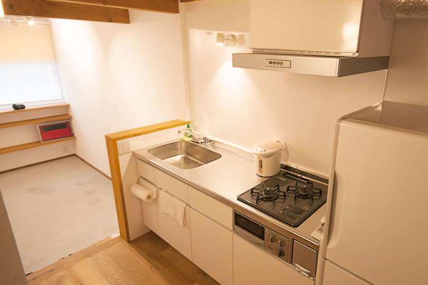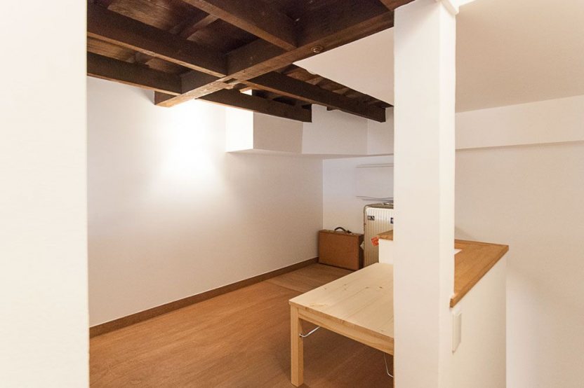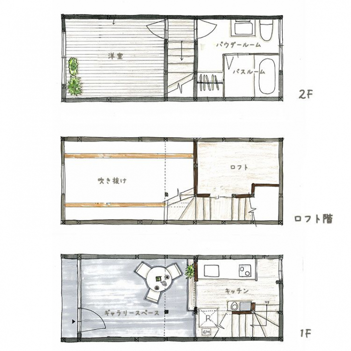 建物は間口が2.6mと決して広いものではありませんでした。限られた空間でも狭く感じないよう、プランニングでは上下方向に空間を効率的に使うことを意識しました。1階のギャラリースペースや2階の洋室は高さを出すことで抜け感を出し、スキップフロアのようにキッチンやロフトを設けることで開放感を保ちながらも空間を区切るように設計しました。階段下や小屋裏部分も収納スペースにして空間を余すことなく使えるように工夫しています。