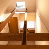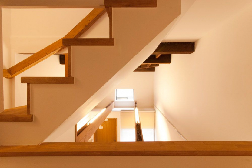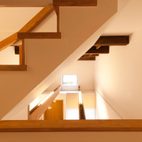 安全に昇降できる勾配を計算し設計しました。階段は集成材を現場で塗装して仕上げ、手すりも階段に合わせて造作しました。