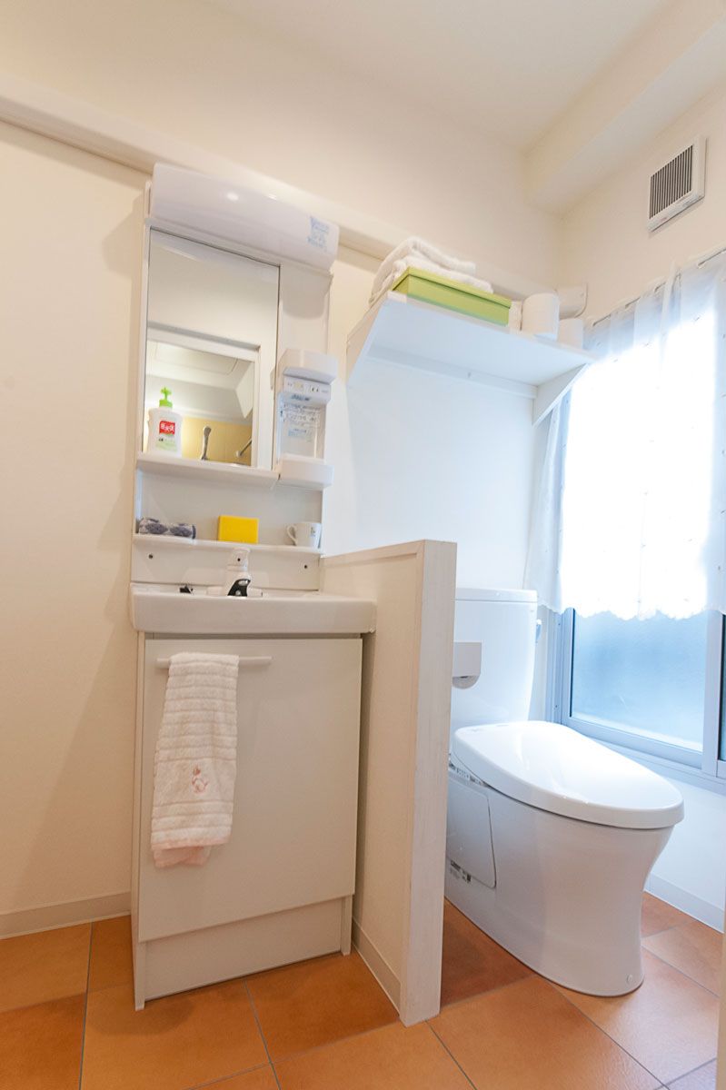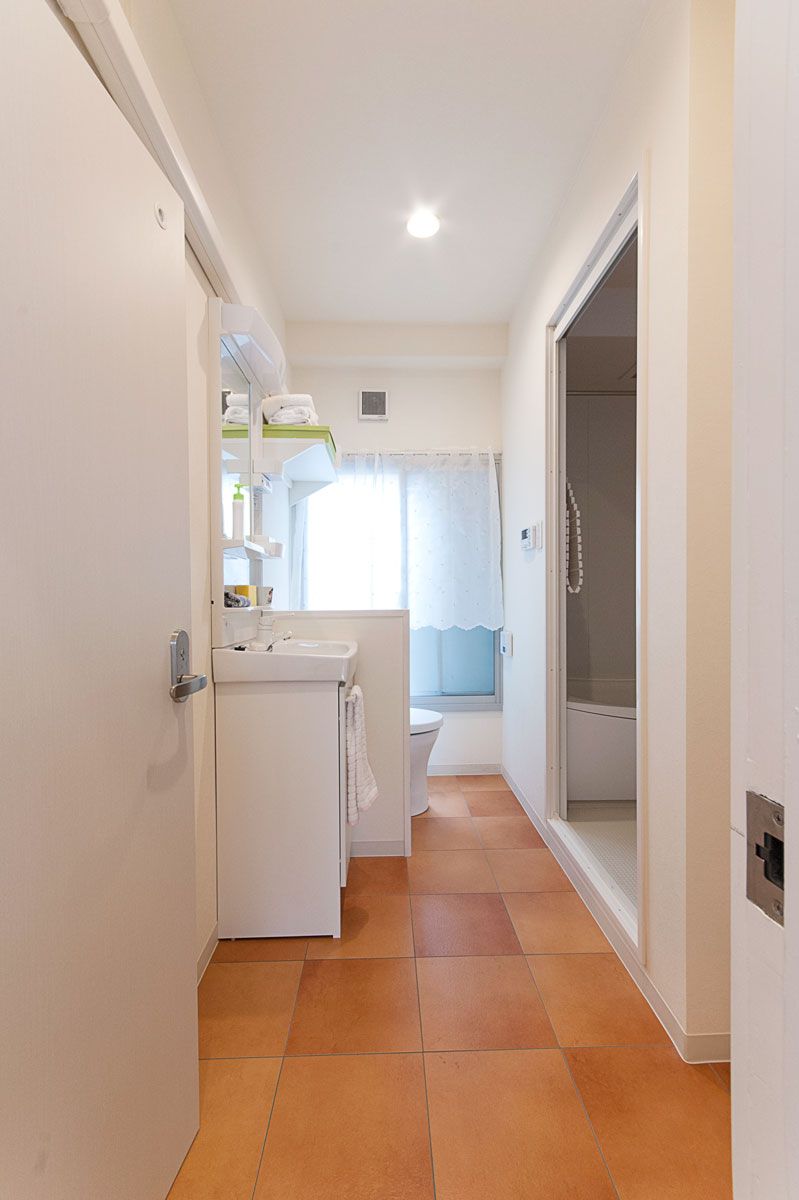 ゲストハウスとしても使用するため、和室だった場所にバスルームやパウダールームを新設しました。水回りを一か所にまとめたことで空間が広々として明るい印象です。パウダールームの床やバスルームの浴室パネルには暖色系の色を選びゲストさんにも楽しく使っていただけるような空間となりました。