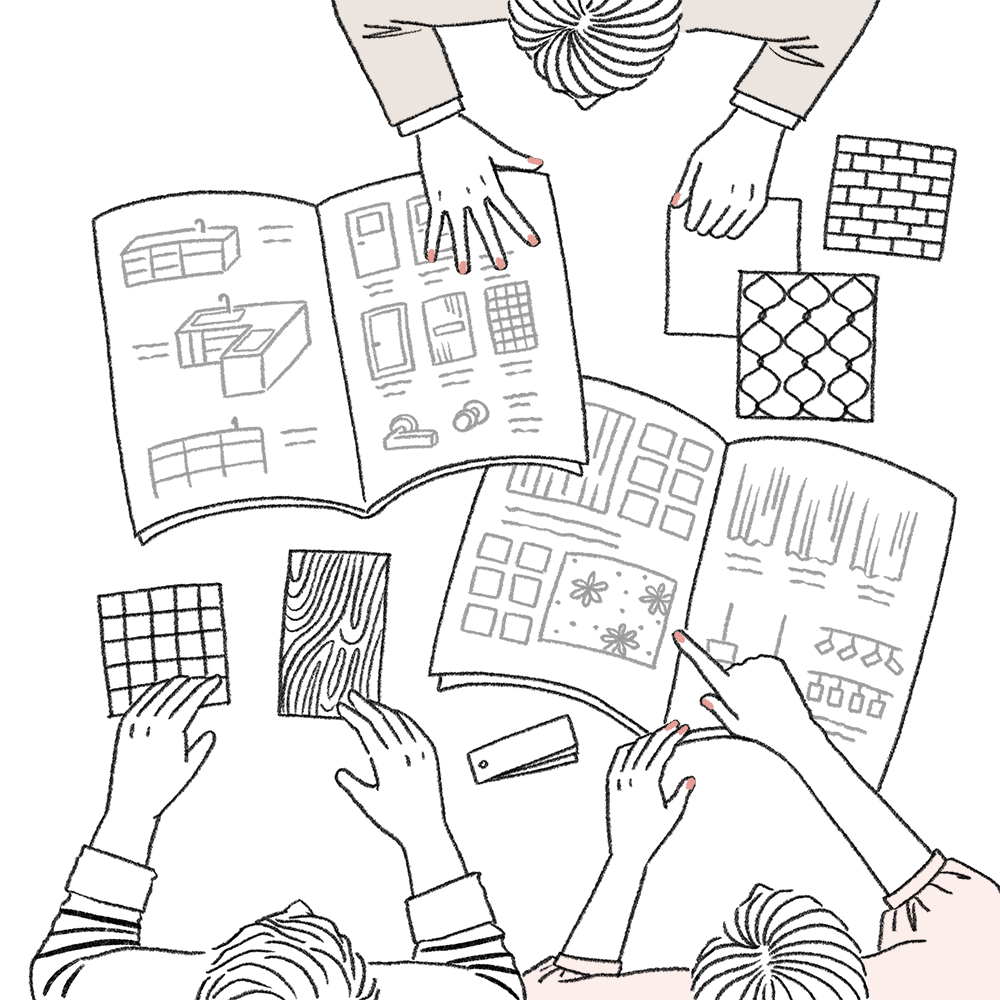 ショールームで設備を確認したり、カタログやサンプルを見ながら仕様を決めていきます。イメージにぴったりのデザインや機能を一緒に選んでいきましょう。