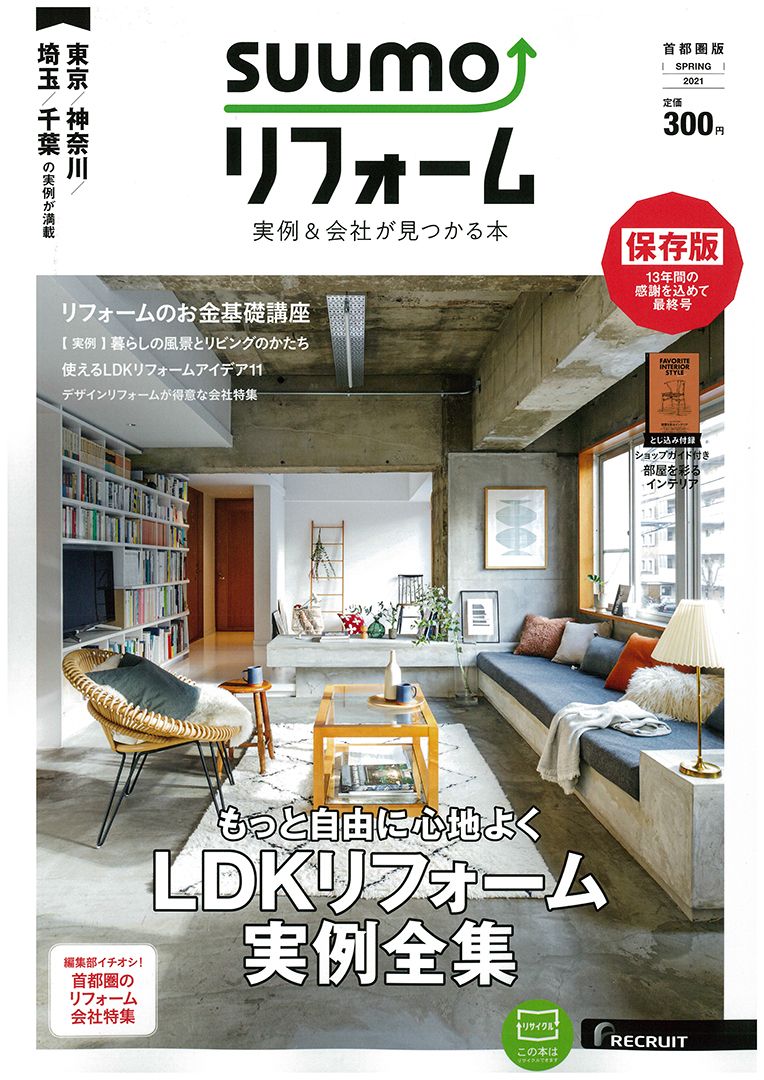 1月29日に発売された「suumoリフォーム 実例&会社が見つかる本」首都圏版SPRING.2021 において、当社が「編集部イチオシ!首都圏のリフォーム会社」として紹介され、当社が手掛けたリフォーム事例も掲載されました。