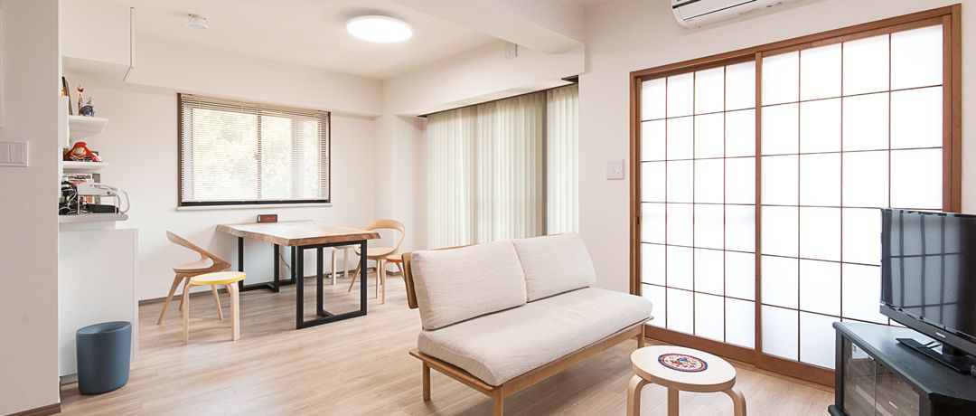和室とリビングを隔てる壁を取り壊し一繋がりにし、リビングの開放感をぐっと引き上げました。キッチン前には造作収納を取り付け、またタンスを撤去した分の収納などを補うようにプランニングしています。